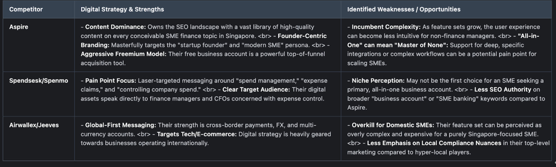 Your Strategic Opening: The market has been educated by Aspire on the “all-in-one” concept. Your opportunity is not to re-educate, but to out-execute on usability and integration. Your messaging must be: “The power of an all-in-one financial OS, but designed to be beautifully simple and seamlessly connected to the Singaporean business ecosystem.”