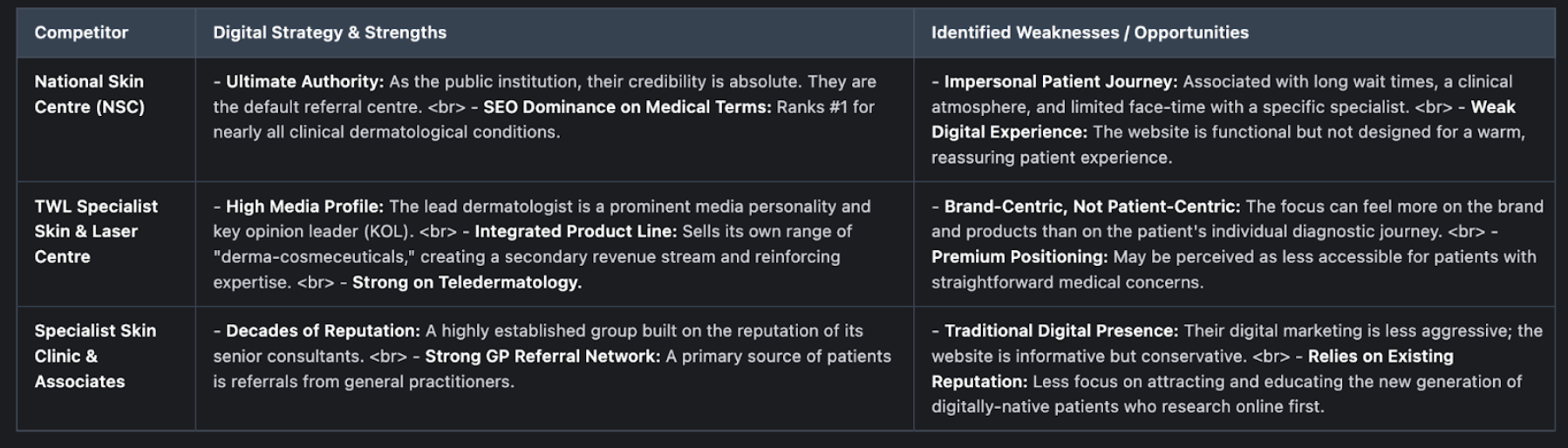 Your Strategic Opening: The NSC is trusted but impersonal. TWL is slick but brand-focused. Established clinics are reputable but digitally conservative. Your opportunity is to be the most educational and patient-centric private dermatologist. You will combine the clinical authority of the NSC with a modern, empathetic digital experience that guides the patient from confusion to clarity.